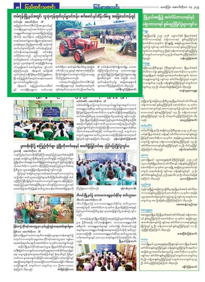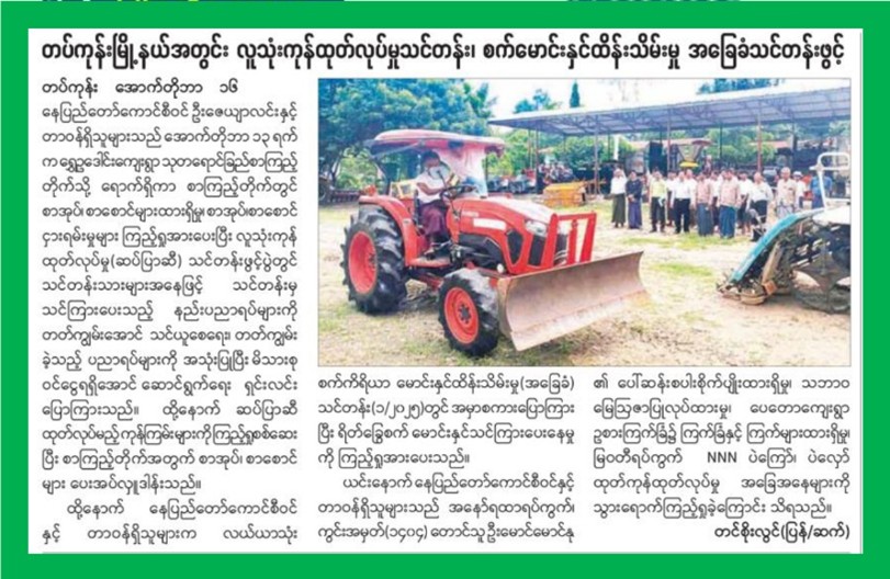 နေပြည်တော်ကောင်စီဝင် ဦးဇေယျာလင်းနှင့်တာဝန်ရှိသူများသည် အောက်တိုဘာလ(၁၃)ရက်နေ့က စက်မှုလယ်ယာဦးစီးဌာနမှ တပ်ကုန်မြို့နယ်တွင်ဖွင့်လှစ်သည့် လယ်ယာသုံးစက်ကိရိယာမောင်းနှင်ထိန်းသိမ်းမှု(အခြေခံ)သင်တန်း (၁/၂၀၂၅) ဖွင့်ပွဲသို့တက်ရောက်၍ နေပြည်တော်ကောင်စီဝင်မှ အမှာစကားပြောကြားပြီး သင်တန်းသားများအား ထွန်စက်နှင့်ရိတ်သိမ်းခြွေလှေ့စက် မောင်းနှင်သင်ကြားပေးနေမှုကို ကြည်ရှုအားပေးခဲ့ကြသည်။