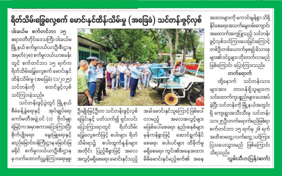 စိုက်ပျိုးရေး၊မွေးမြူရေးနှင့်ဆည်မြောင်းဝန်ကြီးဌာန၊စက်မှုလယ်ယာဦးစီးဌာန၊အမှတ်(၇၈)စက်မှုလယ်ယာစခန်း ဝါးခယ်မမြို့ တွင် စက်တင်ဘာ(၁၅)ရက်နေ့က ရိတ်သိမ်းခြွေလှေ့စက်မောင်းနှင်ထိန်းသိမ်းမှု(အခြေခံ)သင်တန်း (၁/၂၀၂၅)ဖွင့်ပွဲအခမ်းအနားကျင်းပရာ မြို့နယ်စီမံခန့်ခွဲရေးနှင့် အုပ်ချုပ်ရေးကော်မတီ အဖွဲ့ဝင်(၁) မှ အမှာစကားပြောကြားပြီး စက်မှုလယ်ယာဦးစီးဌာန၊ခရိုင်ဦးစီးဌာနမှူးမှ သင်တန်းဖွင့်လှစ်ရခြင်းနှင့်ပါတ်သက်၍ ရှင်းလင်းပြောကြားသည်။အဆိုပါသင်တန်းသို့ မြို့နယ်အတွင်းရှိ ကျေးရွာအသီးသီးမှ သင်တန်းသား(၂၅)ဦး တက်ရောက်ကြမည်ဖြစ်ပြီး စက်တင်ဘာလ(၁၅)ရက်မှ စက်တင်ဘာလ(၂၆)ရက်ထိ စာတွေ့၊ လက်တွေ့ သင်ကြား ပို့ချမည်ဖြစ်သည်။