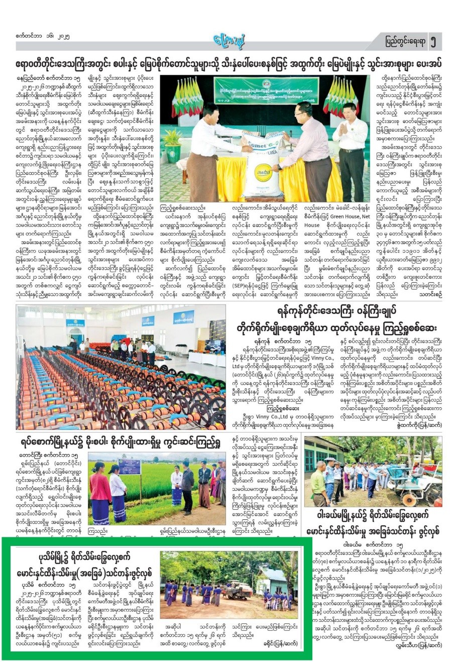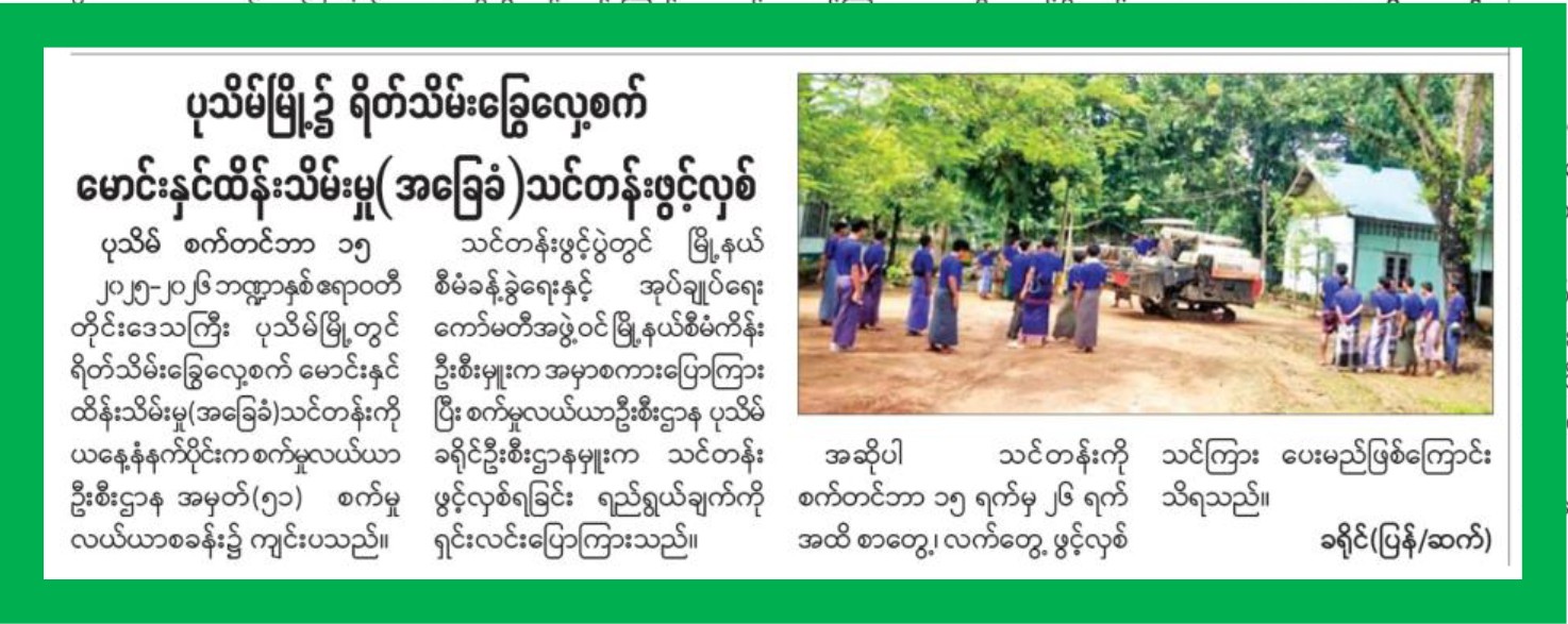စိုက်ပျိုးရေး၊မွေးမြူရေးနှင့်ဆည်မြောင်းဝန်ကြီးဌာန၊စက်မှုလယ်ယာဦးစီးဌာန၊အမှတ်(၅၁)စက်မှုလယ်ယာစခန်း ပုသိမ်မြို့ တွင် စက်တင်ဘာ(၁၅)ရက်နေ့က ရိတ်သိမ်းခြွေလှေ့စက်မောင်းနှင်ထိန်းသိမ်းမှု(အခြေခံ)သင်တန်း ဖွင့်ပွဲအခမ်းအနားကျင်းပရာ မြို့နယ်စီမံခန့်ခွဲရေးနှင့်အုပ်ချုပ်ရေးကော်မတီ အဖွဲ့ဝင်၊ မြို့နယ်စီမံကိန်း ဦးစီးဌာနမှူး မှ အမှာစကားပြောကြားပြီး စက်မှုလယ်ယာဦးစီးဌာန၊ ခရိုင်ဦးစီးဌာနမှူးမှ သင်တန်း ဖွင့်လှစ် ရခြင်းရည်ရွယ်ချက်ကို ရှင်းလင်းပြောကြားသည်။ အဆိုပါသင်တန်းကို စက်တင်ဘာလ(၁၅)ရက်မှ စက်တင်ဘာလ(၂၆)ရက်ထိ စာတွေ့၊ လက်တွေ့ သင်ကြား ပို့ချမည်ဖြစ်သည်။