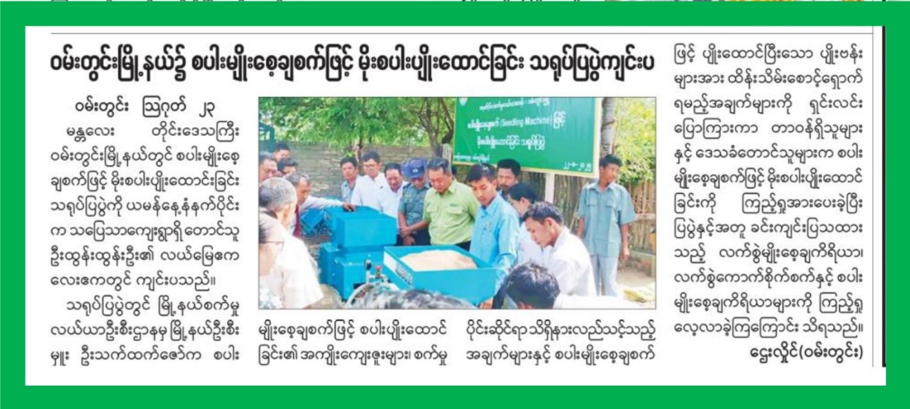 မန္တလေးတိုင်းဒေသကြီး၊ ဝမ်းတွင်းမြို့နယ်၌ စပါးမျိုးစေ့ချစက်ဖြင့် မိုးစပါးပျိုးထောင်ခြင်း သရုပ်ပြပွဲကို ဩဂုတ်လ(၂၃)ရက်နေ့ နံနက်ပိုင်းက သပြေသာကျေးရွာရှိ တောင်သူဦးထွန်းထွန်းဦး၏ လယ်မြေတွင် ကျင်းပသည်။သရုပ်ပြပွဲတွင် စက်မှုလယ်ယာဦးစီးဌာန၊မြို့နယ်ဦးစီးဌာနမှူးမှ စပါးမျိုးစေ့ချစက်ဖြင့် စပါးပျိုးထောင်ခြင်း၏ အကျိုးကျေးဇူးများ၊ စက်မှုပိုင်းဆိုင်ရာအချက်အလက်များ၊ ပျိုးထောင်ပြီးသော ပျိုးဗန်းများအား ထိန်းသိမ်းစောင့်ရှောက်ရမည့်အချက်များအား ရှင်းလင်းပြောကြားသည်။ထို့နောက် တာဝန်ရှိသူများနှင့် တောင်သူများက စပါးမျိုးစေ့ချစက်ဖြင့် မိုးစပါးပျိုးထောင်ခြင်းကိုကြည့်ရှုအားပေးပြီး ပြပွဲနှင့်အတူ ခင်းကျင်းပြသထားသည့် လက်ဆွဲမျိုးစေ့ချကိရိယာ၊ လက်ဆွဲကောက်စိုက်စက်နှင့် စပါးမျိုးစေ့ချကိရိယာ များကို ကြည့်ရှုလေ့လာခဲ့ကြသည်။