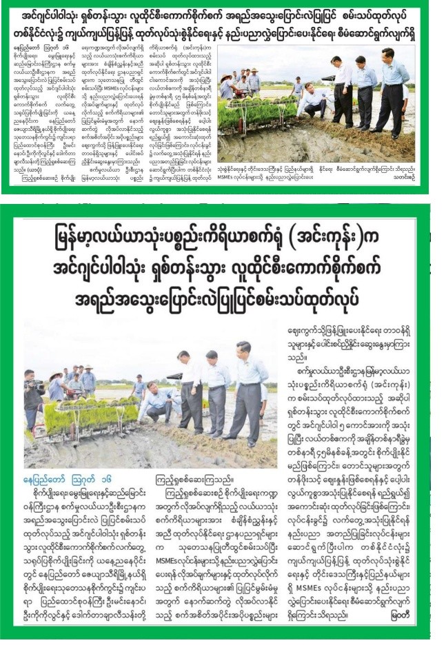 စက်မှုလယ်ယာဦးစီးဌာန မြန်မာ့လယ်ယာသုံးစက်ကိရိယာစက်ရုံ(အင်းကုန်)က စမ်းသပ်ထုတ်လုပ် ထားသည့် အဆိုပါရှစ်တန်းသွား လူထိုင်စီး ကောက်စိုက်စက်တွင် အင်ဂျင်ပါဝါငါးကောင်အားကို အသုံးပြုပြီး လယ်တစ်ဧကကို အချိန် တစ်နာရီခွဲ မှ တစ်နာရီ၄၅မိနစ်အတွင်း စိုက်ပျိုးနိုင်မည်ဖြစ်ကြောင်း တောင်သူများ အတွက် တန်ဖိုးသင့်ဈေးနှုန်းဖြစ်စေရန်နှင့် ပေါ့ပါးလွယ်ကူစွာ အသုံးပြုနိုင်ရန် နည်းပညာအတည်ပြုခြင်း လုပ်ငန်းများ ဆောင်ရွက်ပြီးစီးပါက တစ်နိုင်ငံလုံး ကျယ်ကျယ်ပြန့်ပြန့် ထုတ်လုပ်သုံးစွဲနိုင်ရေးနှင့် တိုင်းဒေသကြီးနှင့်ပြည်နယ်များရှိ MSMEs လုပ်ငန်းများသို့ နည်းပညာလွှဲပြောင်းပေးနိုင်ရေး စီမံဆောင်ရွက် လျက်ရှိသည်။