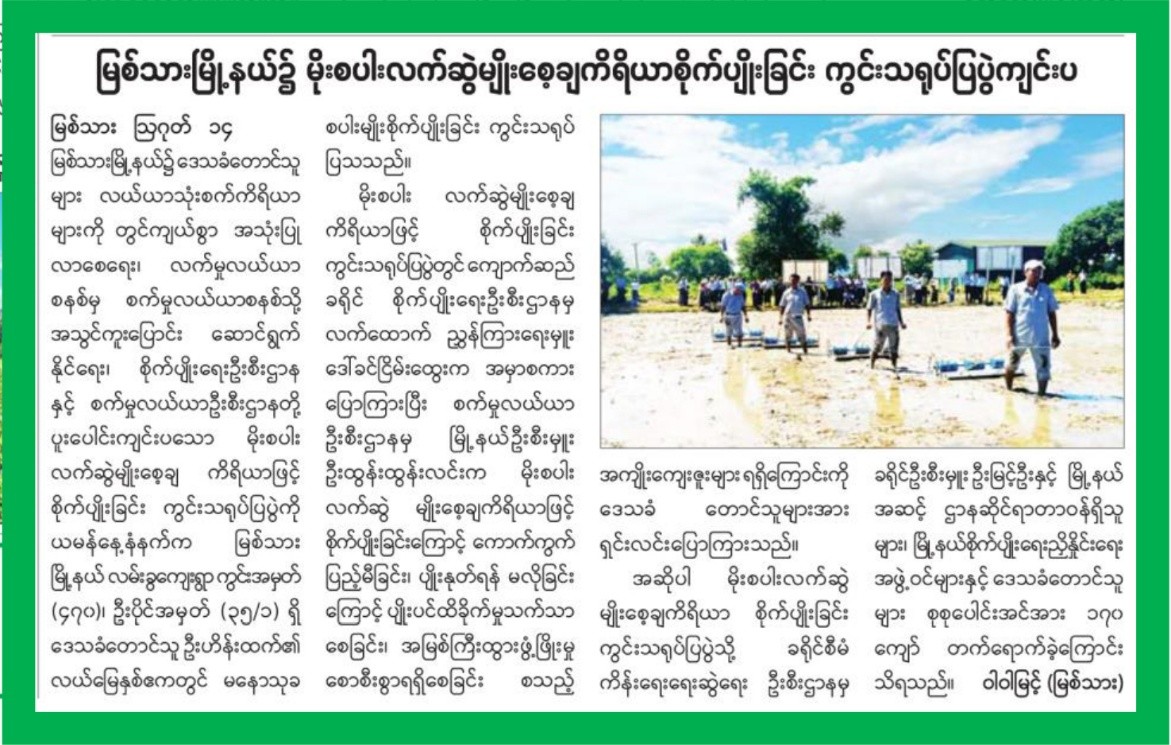 စက်မှုလယ်ယာဦးစီးဌာနနှင့်စိုက်ပျိုးရေးဦးစီးဌာနတို့ ပူးပေါင်းကျင်းပသော လက်ဆွဲမျိုးစေ့ချကိရိယာဖြင့် မိုးစပါးစိုက်ပျိုးခြင်း သရုပ်ပြပွဲအား ဩဂုတ်လ(၁၄)ရက်နေ့နံနက်က မြစ်သားမြို့နယ် လမ်းခွကျေးရွာ ကွင်းအမှတ် (၄၇၀) ဦးပိုင်အမှတ်(၃၅/၁)ပေါ်ရှိ တောင်သူဦးဟိန်းထက်၏ လယ်မြေ(၂)ဧကပေါ်တွင် ကျင်းပပြုလုပ်ခဲ့ရာ ခရိုင်စီမံကိန်းရေးဆွဲရေးဦးစီးဌာနမှူး၊ မြို့နယ်စိုက်ပျိုးရေးညှိနှိုင်းရေးအဖွဲ့ဝင်များ၊ မြို့နယ်အဆင့် ဌာနဆိုင်ရာများနှင့် ဒေသခံတောင်သူ (၁၇၀)ကျော် တက်ရောက်ခဲ့ပါသည်။