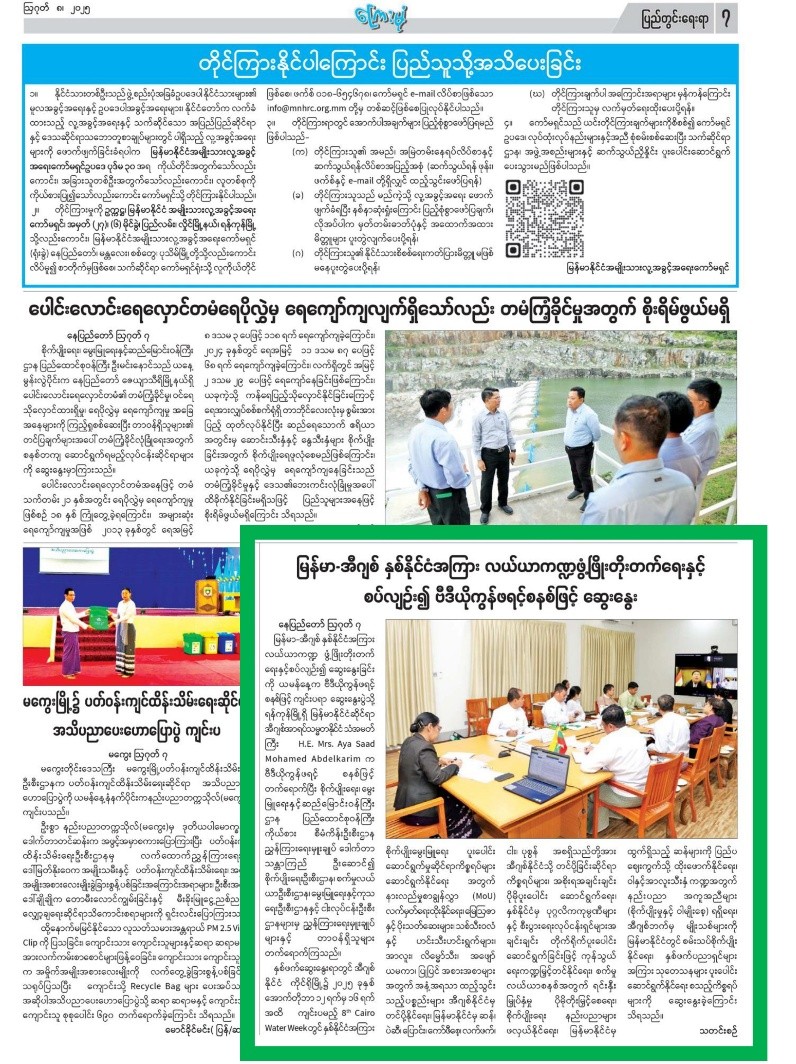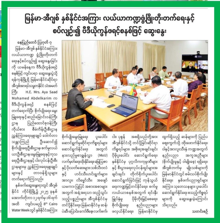 မြန်မာ-အီဂျစ်နှစ်နိုင်ငံအကြား လယ်ယာကဏ္ဍ ဖွံ့ဖြိုးတိုးတက်ရေးနှင့်စပ်လျဉ်း၍ ဆွေးနွေးခြင်းကို ဩဂုတ်လ (၇)ရက်နေ့က ဗီဒီယိုကွန်ဖရန့်စနစ်ဖြင့်ဆွေးနွေးရာ ရန်ကုန်မြို့ရှိ အီဂျစ်အာရပ်သမ္မတနိုင်ငံ သံအမတ်ကြီး H.E. Mrs. Aya Saad Mohamed Abdelkarim က ဗီဒီယိုကွန်ဖရန့်စနစ်ဖြင့် တက်ရောက်ပြီး စိုက်ပျိုးရေး၊မွေးမြူရေးနှင့် ဆည်မြောင်းဝန်ကြီးကိုယ်စား စီမံကိန်းဦးစီးဌာန ညွှန်ကြားရေးမှူးချုပ် ဒေါက်တာ သန္တာကြည် ဦးဆောင်၍ စိုက်ပျိုးရေးဦးစီးဌာန၊စက်မှုလယ်ယာဦးစီးဌာန၊မွေးမြူရေးနှင့်ကုသရေးဦးစီးဌာနနှင့်ငါးလုပ်ငန်းဦးစီးဌာနများမှ ညွှန်ကြားရေးမှူးချုပ်များနှင့်တာဝန်ရှိသူများ တက်ရောက်ကြသည်။