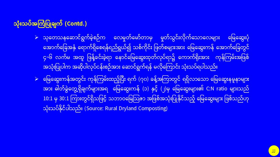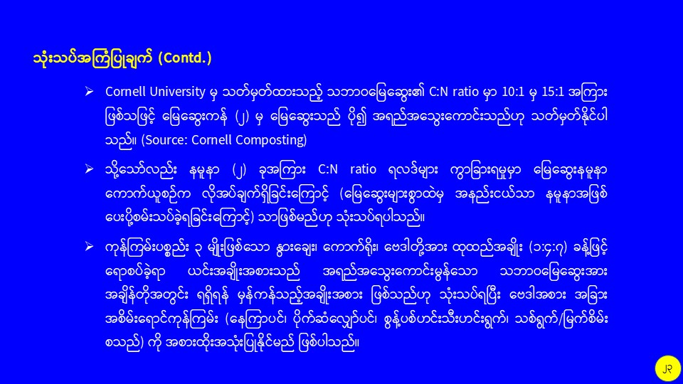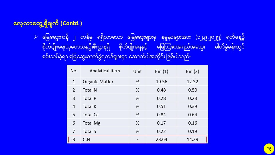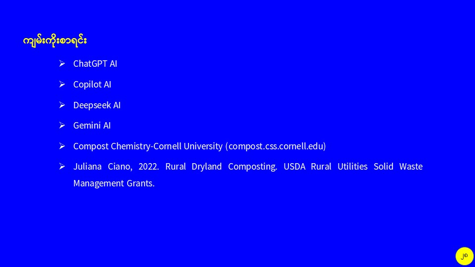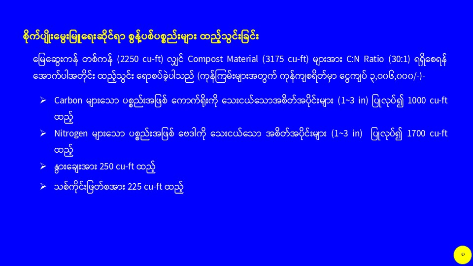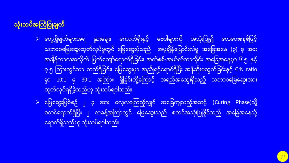 စိုက်ပျိုးမွေးမြူရေးဆိုင်ရာစွန့်ပစ်ပစ္စည်းများကို အသုံးပြု၍ လေပေးစနစ်ပါ မြေဆွေးကန်ကြီးဖြင့် သဘာဝမြေဆွေးထုတ်လုပ်မှု သုတေသနလုပ်ငန်း