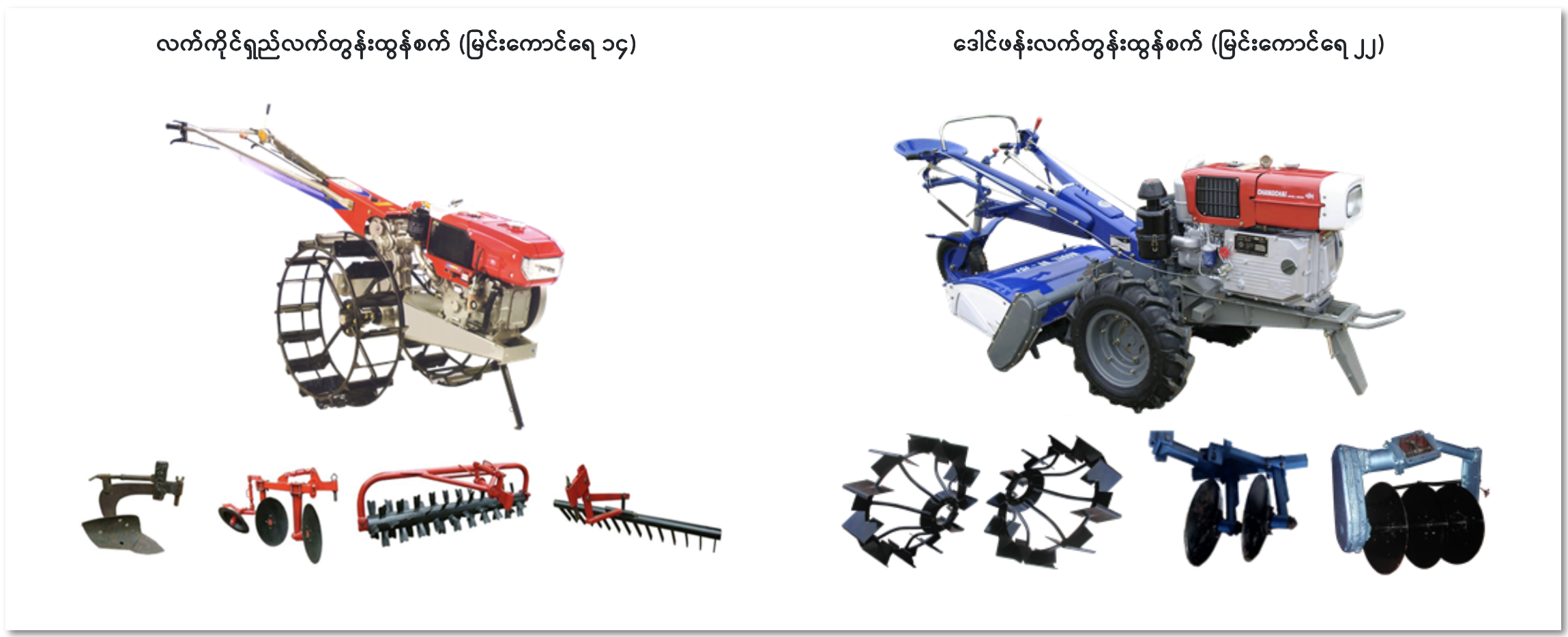 တောင်သူလယ်သမားများအတွက် ဒေါင်ဖန်းလက်တွန်းထွန်စက်နှင့်တွဲဖက်ကိရိယာများ၊ လက်ကိုင်ရှည်လက်တွန်းထွန်စက်နှင့်တွဲဖက်ကိရိယာများ၊ ရိတ်သိမ်းခြွေလှေ့စက်များကို လက်ငင်းစနစ်နှင့်အရစ်ကျစနစ်များဖြင့် တိုင်းဒေသကြီး/ ပြည်နယ်အသီးသီးရှိ စက်မှုလယ်ယာဦးစီးဌာန၏ စက်မှုလယ်ယာစခန်းများမှတဆင့် ဖြန့်ဖြူးရောင်းချပေးလျက်ရှိပါသည်။